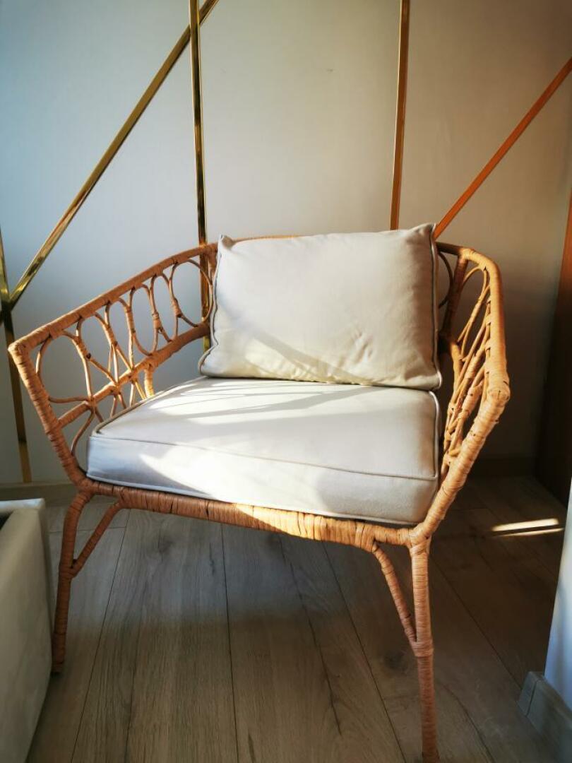 Stylowy fotel wypoczynkowy z rattanu z białą poduszką. Mebel wykonany z wysokiej jakości materiałów, idealnie pasujący do nowoczesnych wnętrz. Wygodny i trwały, doskonale sprawdzi się w salonie lub na tarasie.